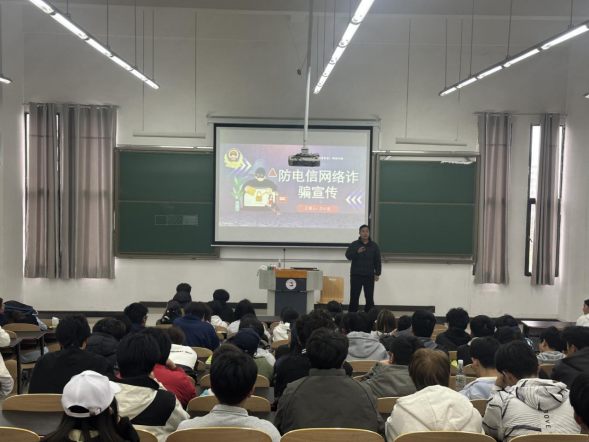 3月13日下午,贵安新区公安局指挥中心民警王小龙受邀走进我校南校区,为建筑工程学院2025级全体学生开展反电信网络诈骗主题讲座。